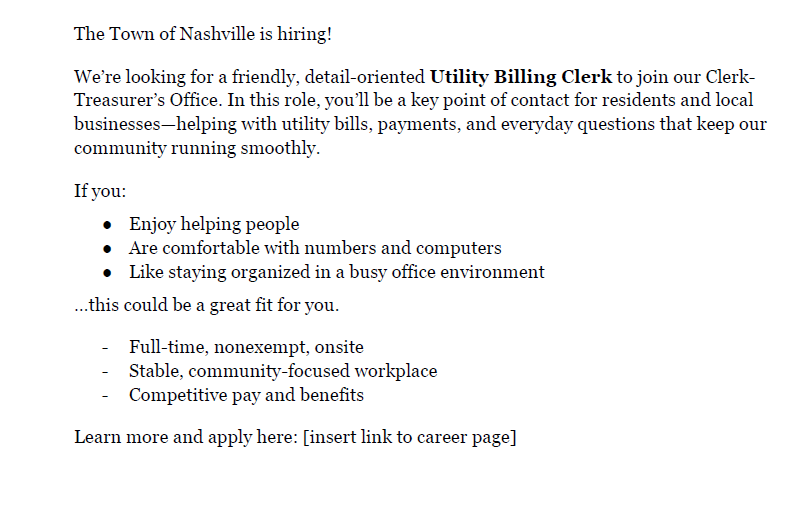 The Clerk-Treasurer’s Office is seeking to employ a qualified individual for the position of Utility Billing Clerk!